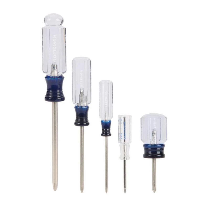 This Craftsman 5 pc. Acetate Screwdriver Set features acetate handles with heat-treated, alloy steel blades for increased durability. A comfort optimized handle is ideal for high and low torque applications. Blades and shafts are coated with a satin-nickel finish to resist corrosion.