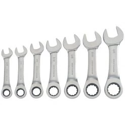 The Craftsman 7 pc. SAE Stubby Ratcheting Combination Wrench Set offers a number of applications from standard bolt turning to specific automotive repairs.