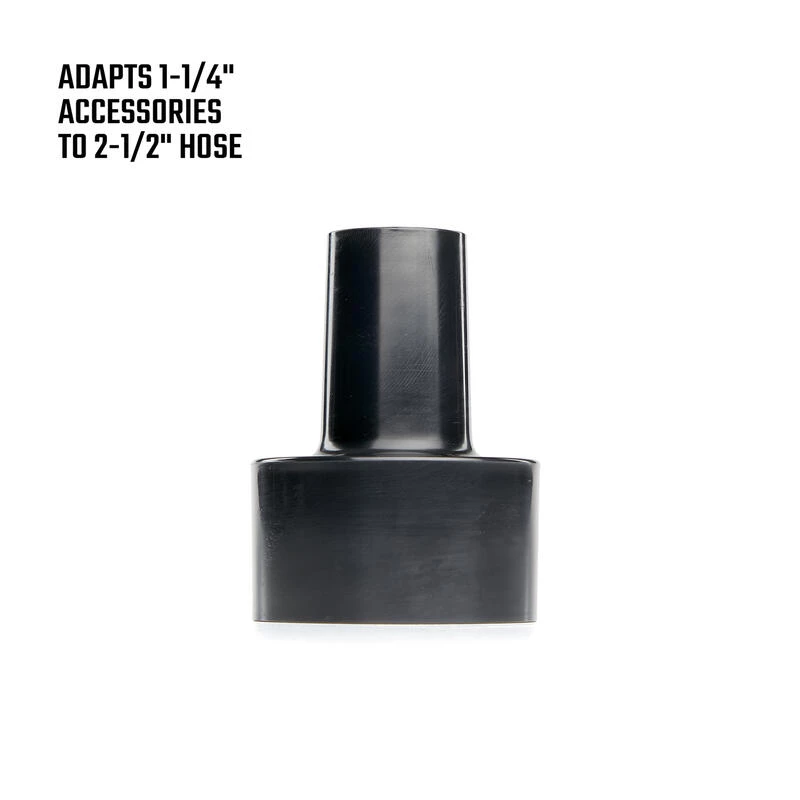 The CRAFTSMAN 2-1/2-inch to 1-1/4-inch Adapter is easy to use and allows you to use smaller attachments with larger shop vacuums for things like dust collection. Just slip one end into your wet/dry vac hose and the other end is ready to accept smaller hoses and attachments designed for smaller vacs.