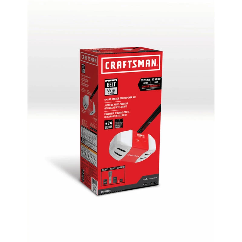 With the capacity to lift residential garage doors up to 7-ft. high, the CRAFTSMAN® ½ HPs Belt Drive Garage Door Opener Kit can be characterized as the strong, silent type. Providing years of smooth, reliable and quiet operation, this garage door opener is perfect for homes with attached garages. With integrated Wi-Fi® and smartphone control via the CRAFTSMAN myQ® App, you’ll receive real-time alerts, plus be able to open and close your garage door from anywhere at anytime straight from the palm of your hand. The opener comes with a dual function wall control for easy programming and an outside wireless keypad for wireless, one-touch access. The 3-button remote control allows you to easily program up to three garage doors and boasts a frequency range of up to 1,500 ft. safety reversing sensors come standard.