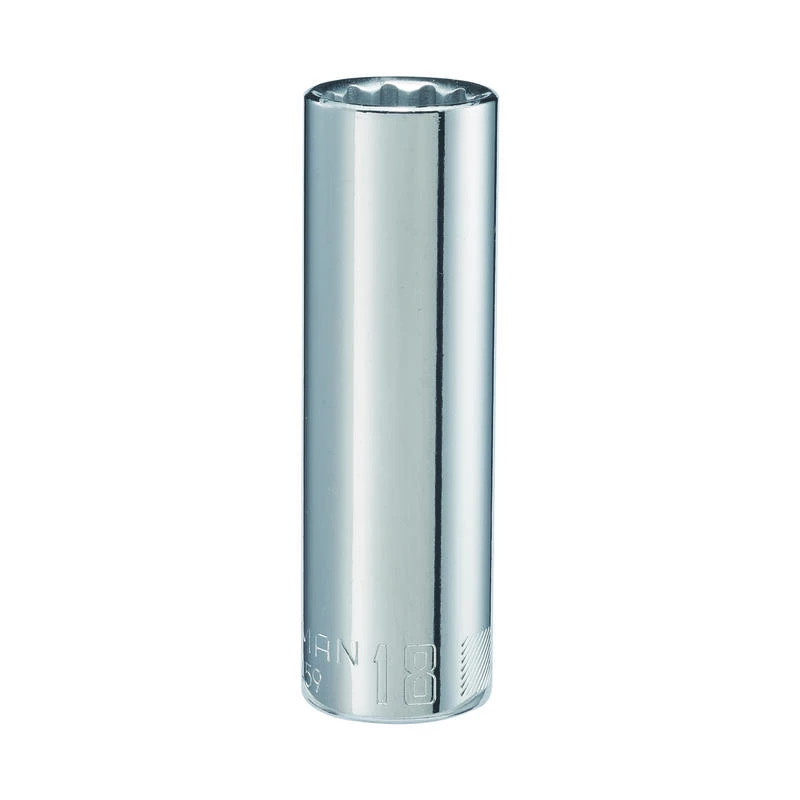 1/2-in. Drive 18mm 12 Point Deep Socket features a deep well construction and internal construction designed to engage with the flats of fasteners. This allows for the user to reach those hard to reach fasteners and torque without the fear of stripping a bolt.