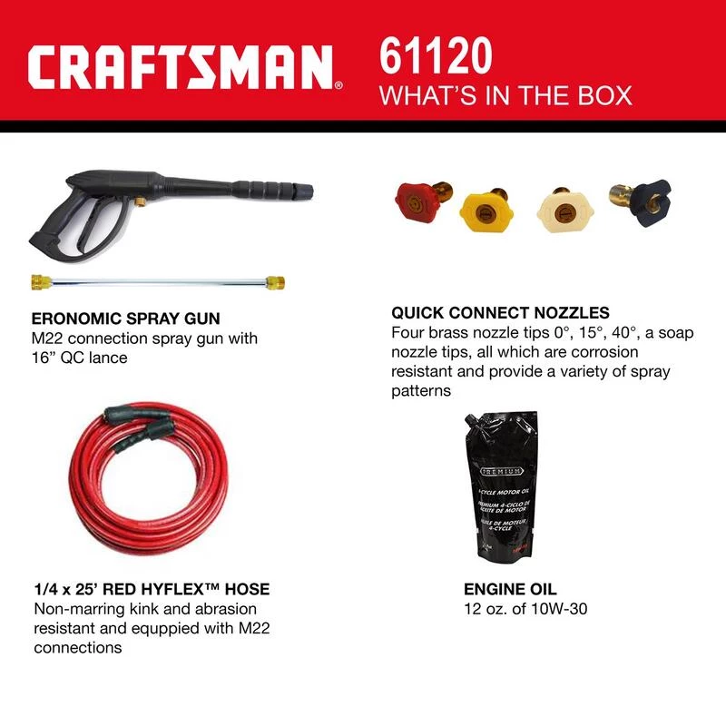 The Craftsman 2800 PSI at 2.3 GPM gas pressure washer powered by a reliable Briggs & Stratton 725EXI engine provides all the power you need to tackle your cleaning tasks. Four quick-connect spray tips allow you to quickly adjust the spray pattern to best fit the task at hand, a 25-foot Red HyflexTM hose makes for easy maneuvering and the fold-down handle allows for easier storage.