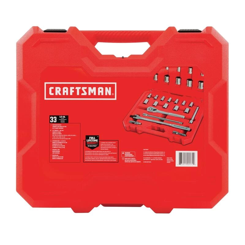 Craftsman 33 pc. 1/2 Drive Mechanics Tools Set comes equipped with a 72-Tooth ratchet, a broad assortment of drive tools, and a rugged blow mold case. This case is constructed with metal hinges for separate sets, and the dimensions are specifically designed to fit into CRAFTSMAN® metal storage boxes for easy organization.