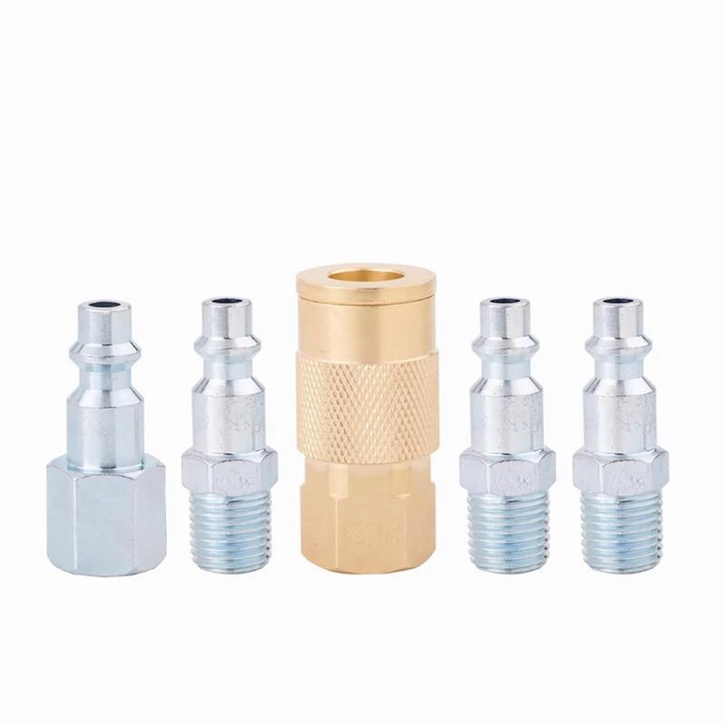Made from high-quality materials, this industrial connection kit includes four steel male plugs and one female brass coupler.